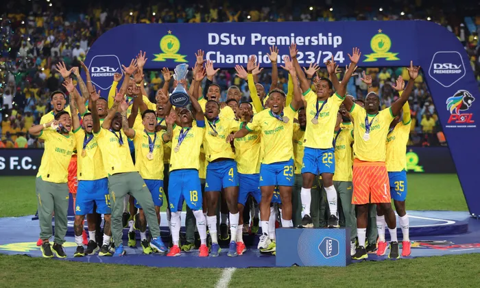 IMAMELODI Sundowns iphakamisa indebe yeDStv Premiership okwehlandla lesikhomisa kulandelana Isithombe: BACKPAGEPIX