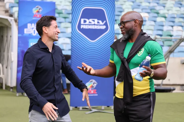 UPABLO Franco Martin, oqeqesha AmaZulu FC, encokola nozakwabo kwiLamontville Golden Arrows, uSteve Komphela, ngesikhathi la maqembu etholene emdlalweni wokusonga isizini yeDStv Premiership, eMoses Mabhida Stadium, ngempelasonto Isithombe: BACKPAGEPIX