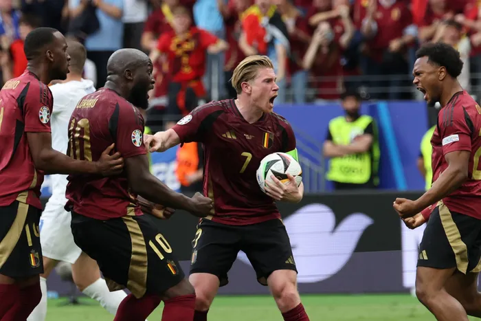 ABADLALI beBelgium bejabulela elinye lamagoli kaRomelu Lukaku eliphikiwe emdlalweni we-Uefa EURO 2024 abashaywe kuwo yiSlovakia ngoMsombuluko Isithombe: EPAL