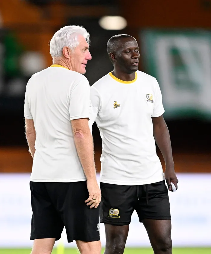 UHELMAN Mkhalele (kwesokudla) uzohola iBafana Bafana ezodlala kwiCosafa Cup eqala ngoLwesithathu eGqeberha. Ubambele umqeqeshi uHugo Broos (ami naye), ozobe engekho kule midlalo Isithombe: BACKPAGEPIX