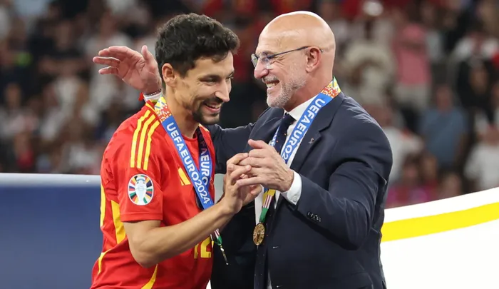 ULUIS de la Fuente (kwesokudla), umqeqeshi weSpain nomdlali wezakhe uJesus Navas ngemuva kokwamukela izindondo zegolide kulandela ukudla isicoco se-Uefa Euro 2024 ngokushaya i-England kowamanqamu, eBerlin, eGermany, ngeSonto ebusuku Isithombe: EPA