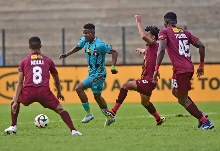 USIPHIWE Mahlangu weTS Galaxy ezama ukudlula kuSihle Nduli weStellenbosch ngesikhathi la maqembu atholene kowama-quarterfinal eMTN8, eDanie Craven Stadium ngeSonto ntambama Isithombe: BACKPAGEPIX