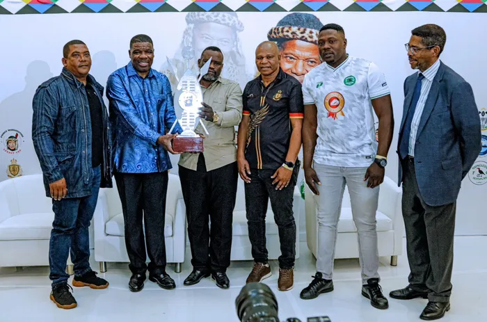 UNGQONGQOSHE wezeMidlalo KwaZulu-Natal, uMntomuhle Khawula noMeya waseZululand, uMichael Khumalo, bebambe indebe ye-Prince Mangosuthu Legacy Cup bephahlwe ngabaqeqeshi bamaqembu abazobamba iqhaza kulo mqhudelwano owethulwe izolo eSouth Sun Hotel, eThekwini Isithombe: SITHUNYELWE