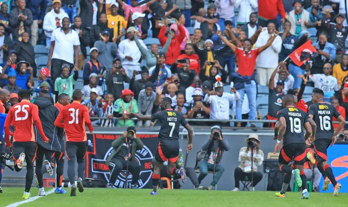 UDEON Hotto ejabula phambi kwabalandeli beqembu lakhe, i-Orlando Pirates ngemuva kokushaya igoli lesibili benqoba iCape Town City kowomlenze wesibili kweyandulela owamanqamu eMTN8, e-Orlando Stadium ngempelasonto Isithombe: BACKPAGEPIX