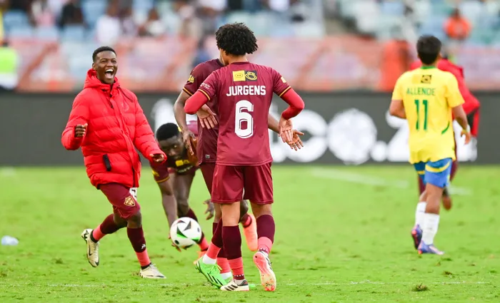 INJABULO kwabanye abadlali beStellenbosch FC ngemuva kokuzibekisela indawo kowamanqamu eMTN8 behlula iMamelodi Sundowns, eMoses Mabhida Stadium, eThekwini ngempelasonto Isithombe: BACKPAGEPIX