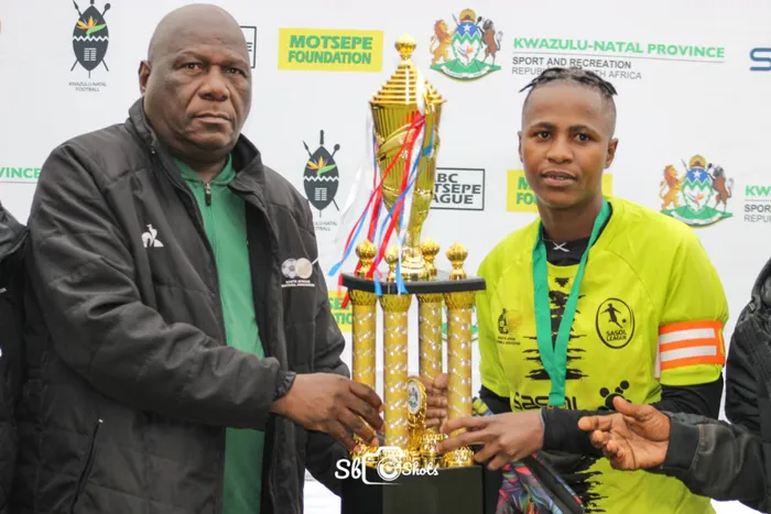 UNOZINTI nokaputeni weZemvelo Women’s FC, uZinhle Ndwalane, emukela indebe yeSafa KwaZulu-Natal Sasol League kusihlalo weSafa KZN, uKwenzakwakhe Ngwenya, ngemuva kokuba ezakhe ziguqise iNewcastle Chess kowokuhlunga ompetha besifundazwe eHarry Gwala Stadium, eMgungundlovu, ngeSonto Isithombe: BADLALELE SHOTS