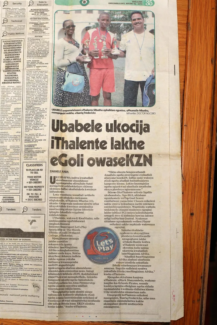 UTHALENTE Mbatha wathathwa lapha ewine umklomelo wenyanga weSuperSport Let’s Play kaFebhuwari 2015. Wayemi nonina uPhumzile Mbatha nomqeqeshi wakhe esikoleni uTaariq Fredericks