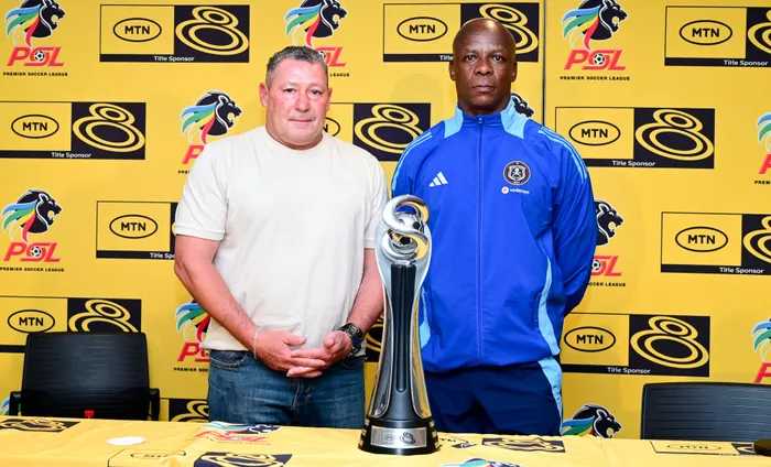 U-STEVE Barker umqeqeshi weStellenbosch FC, noMandla Ncikazi iphini lomqeqeshi kwi-Orlando Pirates, ngesikhathi behambele isithangami nabezindaba izolo, eCoastlands Skye Hotel, eMhlanga, eThekwini. Bobabili babalule ubukhali babadlali abanabo, okuzokwenza umehluko uma sebetholene kowamanqamu weMTN8 kusasa eMoses Mabhida Stadium, eThekwini Isithombe: BACKPAGEPIX