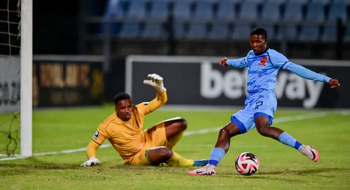 UBONGINKOSI Dlamini wePolokwane City edlula unozinti weRoyal AM, uXolani Ngcobo, ukushaya igoli lokunqoba emdlalweni weBetway Premiership, eHarry Gwala Stadium, eMgungundlovu, ngoLwesithathu Isithombe: BACKPAGEPIX