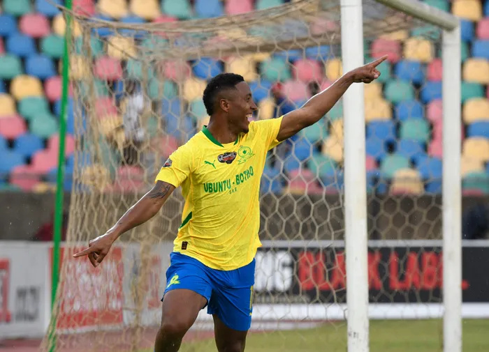 U-LUCAS Ribeiro ngemuva kokushaya igoli lokuqala leMamelodi Sundowns, okube yiphenathi bedlala neMarumo Gallants kowandulela owamanqamu weCarling Knockout eDr Molemela Stadium, ngeSonto Isithombe: BACKPAGEPIX