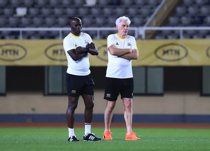 Umqeqeshi weBafana Bafana, uHugo Broos nephini lakhe uHelman Mkhalele ngesikhathi elakuleli liziqeqesha eNelson Mandela Stadium e-Uganda, ngoLwesine Isithombe:BACKPAGEPIX