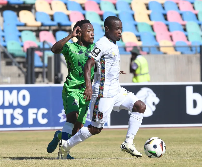 ULINDOKUHLE Mbatha we-TS Galaxy eshikilisana noMonde Mphambaniso weMarumo Galants, ungomunye wabadlala abanamava kuleli qembu elikhombisa ukuvuka emaqandeni muva nje Isithombe: BACKPAGEPIX