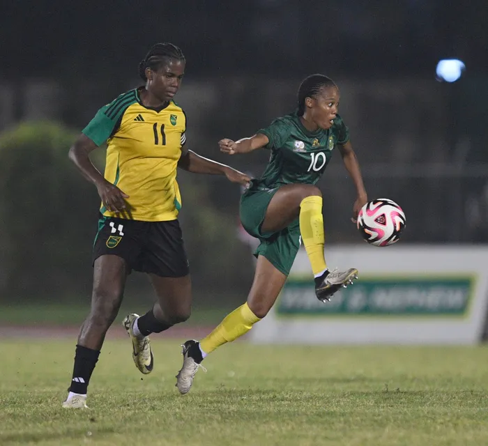 UMDLALI wasesiswini weBanyana Banyana uLinda Motlhalo oxinwe nguKhadija Shaw weJamaica, ushaye elinye lamagoli aleli qembu ngesikhathi lehlulwa yiReggae Girlz eMontego Bay ngoLwesibili ekuseni Isithombe:BACKPAGEPIX