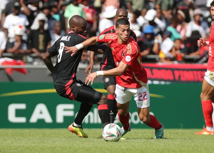 UMAKHEHLENI Makhaula we-Orlando Pirates eshikilisana ne-Emam Ashour we-Al Ahly emdlalweni weCaf Champions League, e-Orlando Stadium, eSoweto, ngoMgqibelo ntambama Isithombe: BACKPAGEPIX