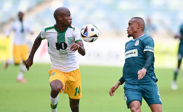 UMDLALI weLamontville Golden Arrows u-Angelo van Rooi ebanga ibhola noRiaan Hanamub waMaZulu emdlalweni weBetway Premiership eMoses Mabhida Stadium, eThekwini, ngoMgqibelo Isithombe:BACKPAGEPIX