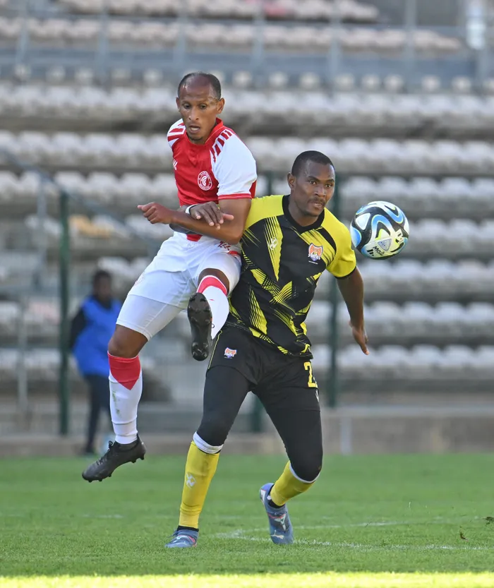 UMGADLI weJDR uPrince Nxumalo, ebanga ibhola nesitobha seCape Town Spurs uNazeer Allie, emdlalweni weligi yeMotsepe Foundation Championship ngoNovemba nyakenye Isithombe:BACKPAGEPIX