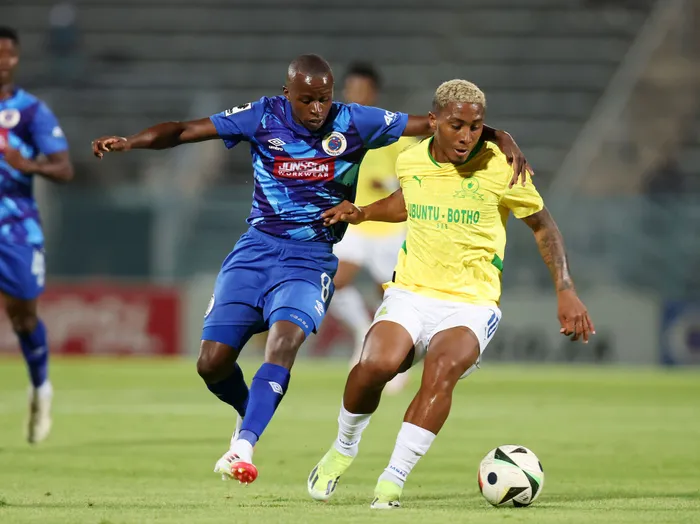 ULUCAS Ribeiro weMamelodi Sundowns obewuhlupho eshikilisana noSiphesihle Ndlovu weSupersport Unied emdlalweni wabakhaya basePitoli weBetway Premiership, eLucas Moripe Stadium, e-Atteridgeville ngoLwesithathu ebusuku Isithombe: BACKPAGEPIX