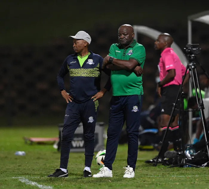 UMQEQESHI weMarumo Gallants uDan Malesela (kwesokudla) nephini lakhe uDuncan Lechesa (kwesokunxele), badunyazwe ukuguqiswa yiRichards Bay umdlalo usuyophela ngoLwesibili Isithombe: BACKPAGEPIX