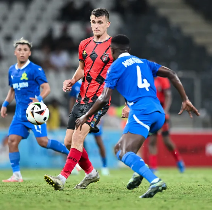 UMGADLI weTS Galaxy, uDzenan Zajmovic, ebanga ibhola noTeboho Mokoena weMamelodi Sundowns emdlalweni weBetway Premiership eMbombela Stadum, eNelspruit, ngoLwesibili ebusuku Isithombe:BACKPAGEPIX