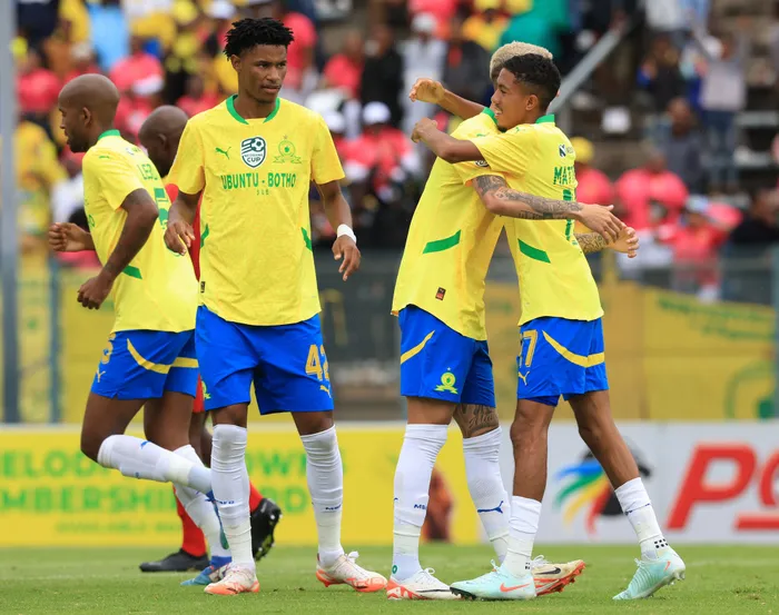 ABADLALI beMamelodi Sundowns bejabulela igoli likaTashreeq Matthews alishaye ngesikhathi bebhekene neMpheni Home Defenders emdlalweni we-Last 16 yeNedbank Cup eLucas Moripe Stadium, ePitoli, ngeSonto Isithombe:BACKPAGEPIX