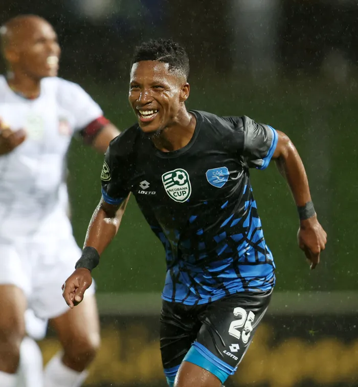 UMGADLI weDurban City, uSenzo Ndlovu, okunguyena oshayele leli qembu igoli lokunqoba iguqisa i-TS Galaxy koweNedbank Cup Last 16 ngempelasonto Isithombe: BACKPAGEPIX