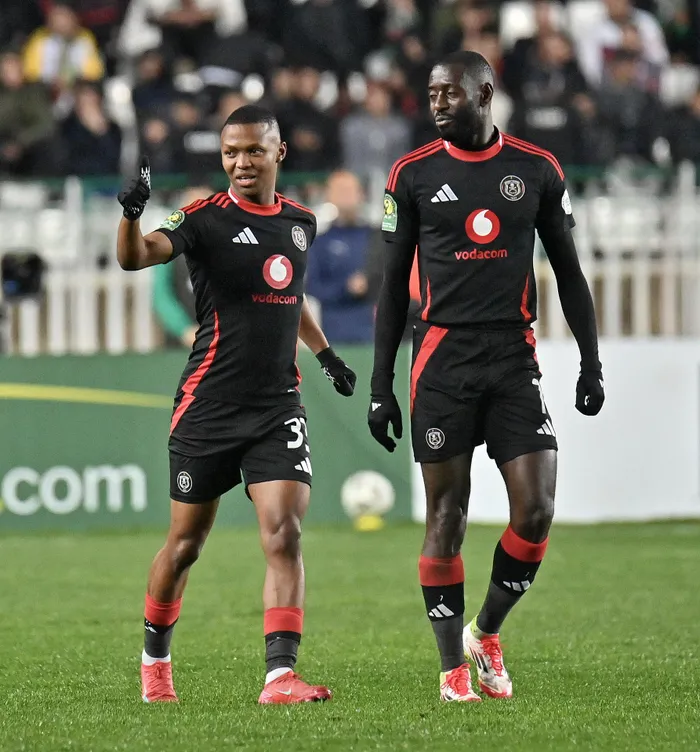 UMOHAU Nkota (kwesokunxele) ejabula nozakwabo uDeon Hotto emuva kokushaya igoli elinqobise i-Orlando Pirates kwiMC Alger emdlalweni womlenze wokuqala we-quarterfinal yeCaf Champions League ngoLwesibili