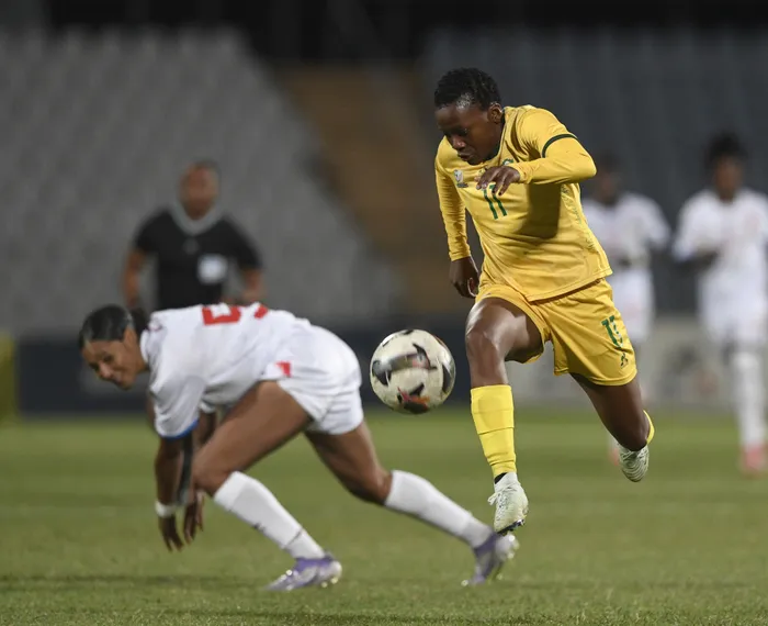 UMGADLI weBanyana Banyana, uThembi Kgatlana, ushaye igoli elifake iqembu lakuleli kwiWomen's Africa Cup of Nations yangonyaka ozayo ngesikhathi linqoba iDemocratic Republic of Congo ngo 1-0 eDobsonville Stadium, eGoli.
