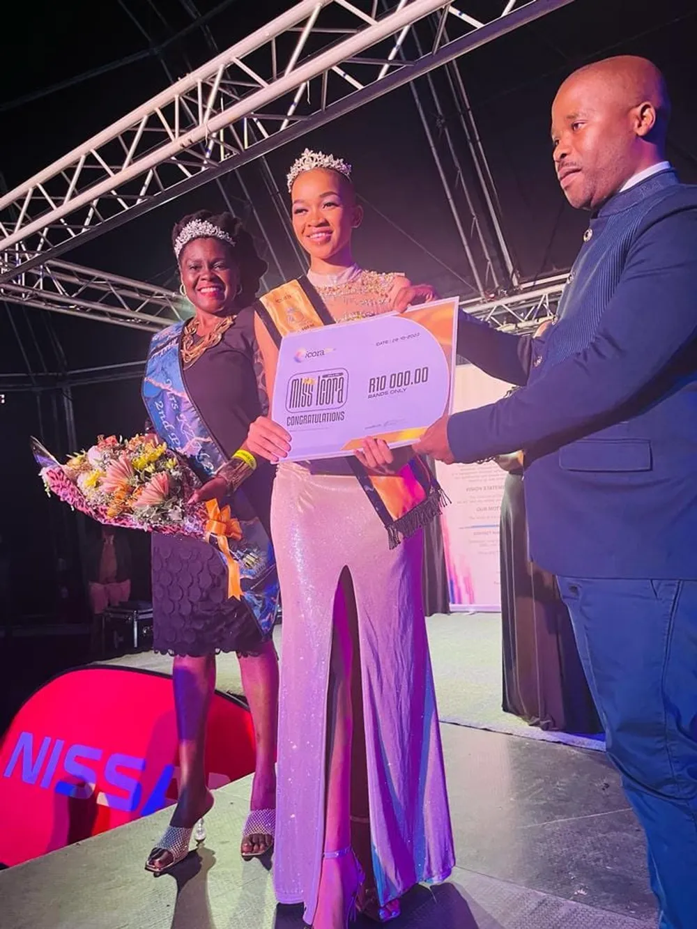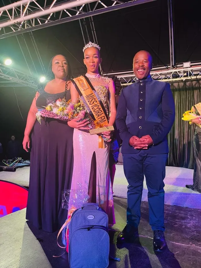 UNOKWAZI “Kwazi” Ndwandwe ophume phambili kuMiss Icora 2022/23, ekakwe wuQaphile KaMahlangu Putsoane nomphathisiteshi,uBonga “Ncwadizeposi” Msweli isithombe:FACEBOOK