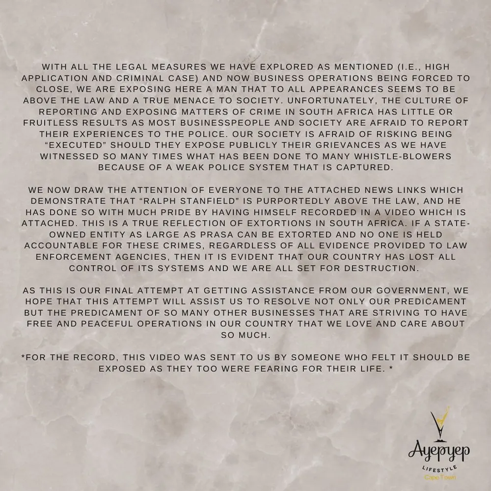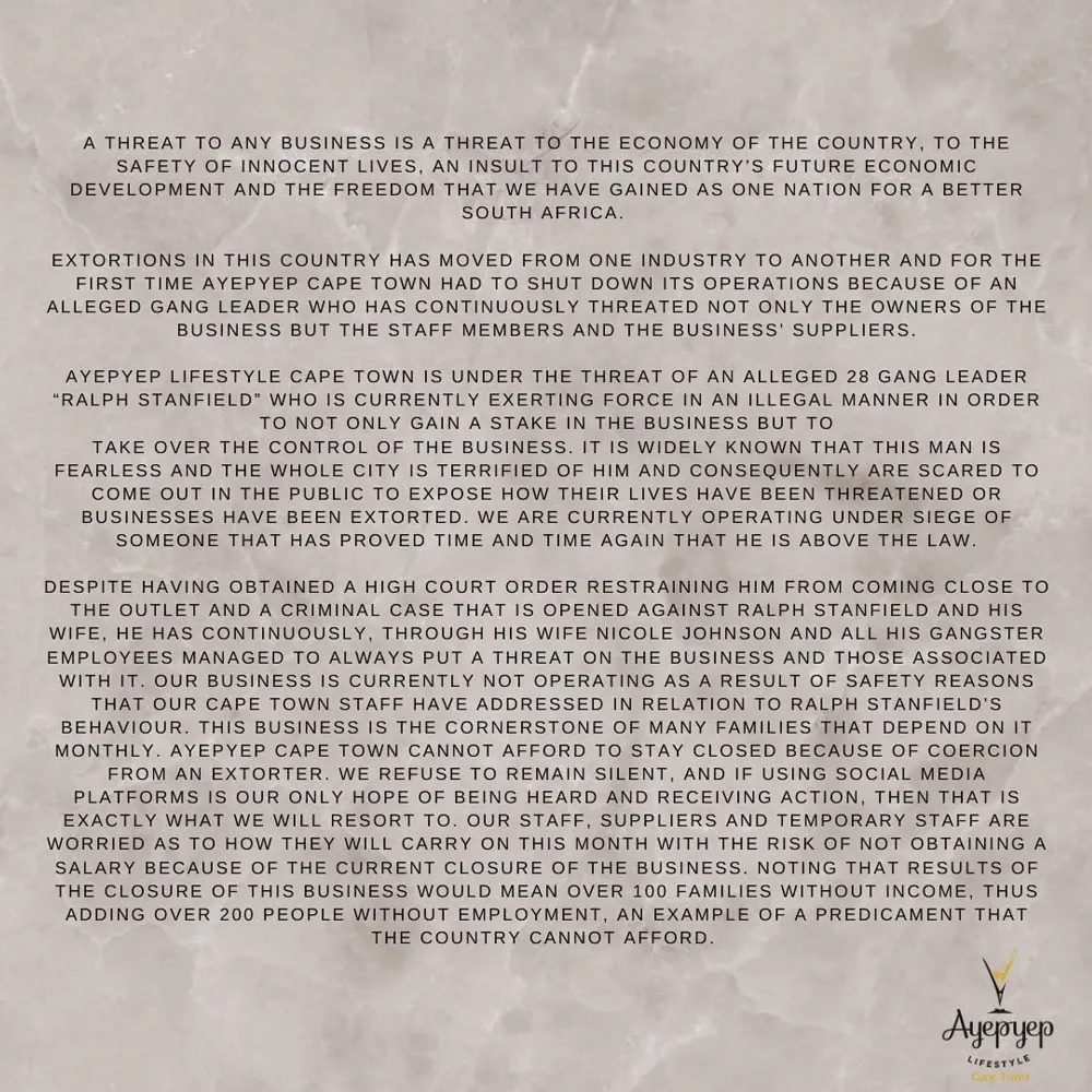“Abaningi bayamazi uRalph Stanfield futhi bayamsaba ngoba uzenzela umathanda yonke indawo. Yize sinayo incwadi yenkantolo enqanda lo mlisa ukuba enze lokhu futhi kunecala lobugebengu avulelwe lona, kodwa uyaqhubeka nokuthuma abasebenzi bakhe ukuthi benze umathanda,” kusho isitatimende.
