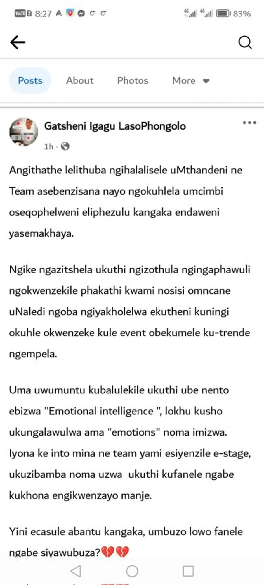 Uxolisa-nje, noGatsheni ubekhiphe isitatimende ngoMsombuluko ekuseni ephawula ngalokhu okwenzeke kuMthandeni Summer Experience. UGatsheni uncome ithimba lakhe ngobuhlakani bokungalawulwa yimizwa, ethi bakubukile okwenzekile kodwa abangavumela imizwa ukuba ibalawule.