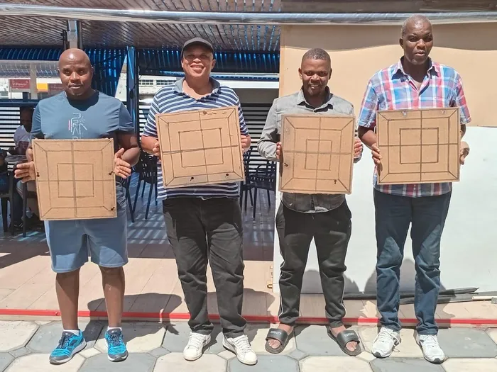 INKAKHA yomsakazi wemidlalo yebhola oKhozini, uJoe Mazweni Hudla, usungule umqhudelwano womdlalo womlabalaba emahostela akuleli. Kwesokunxele uMbuso Thusi, uJoe Hudla, uMzwenkosi Lembede noMthembiseni Thusi