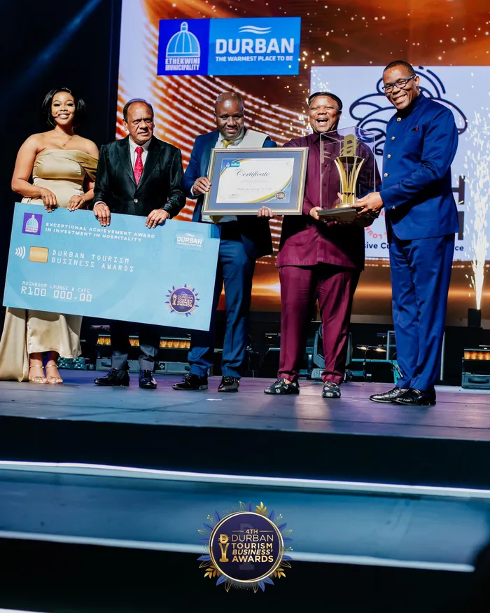 UKWEZI Ndlovu-Mbambo obhekele iMushroom Lounge, usomabhizinisi uMnuz Vivian Reddy, ikhansela eThekwini uMnuz Thembo Ntuli usomabhizinisi ophinde abe umphathi wendawo iMushroom Lounge, uMnuz Sibongiseni Mbambo, noMeya weTheku uMnuz Cyril Xaba, ngesikhathi le ndawo ihlabana ngendondo yeBest Durban Restaurant emcimbini ama-4th annual Durban Tourism Business Awards