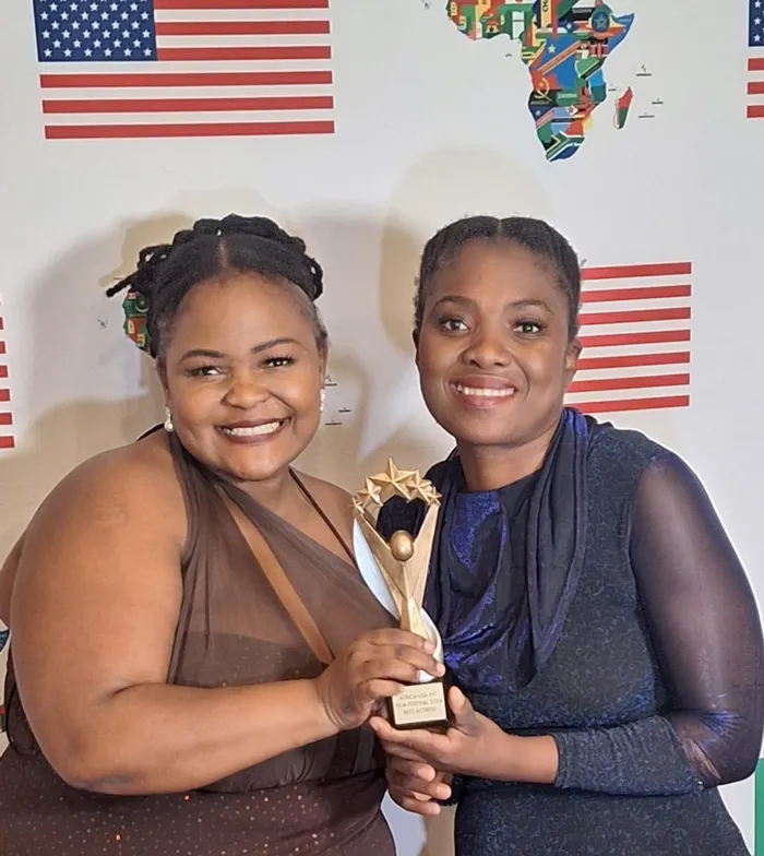 Umbhali wefilimu iZipped, uSamukele Khumalo-Dludla (kwesobunxele) nodadewabo uThembi Khumalo owine indondo ngendawo ayidlala kule filimu e-USA Isithombe: SITHUNYELWE