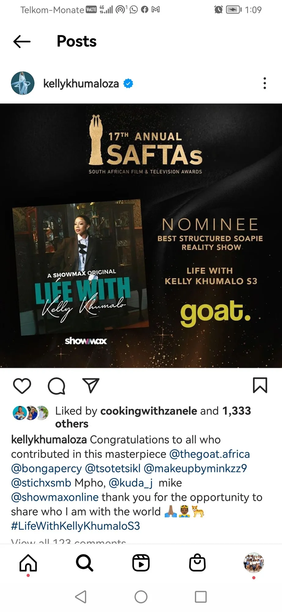 ISIPHALAPHALA somculi wakuleli uKelly Khumalo onohlelo kwiShowmax naveza ukuthi liqokwe kumaSAFTAs Isithombe: KELLY KHUMALO/ INSTAGRAM