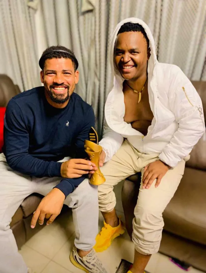 USIMPHIWE Majola (ongakwesokunxele) wayehalalisela obengumculi wakhe, uScebi “Inkosi Yamagcokama” Dlamini, emuva kokunqoba iBest Maskandi kumaSatma Awards Isithombe: FACEBOOK