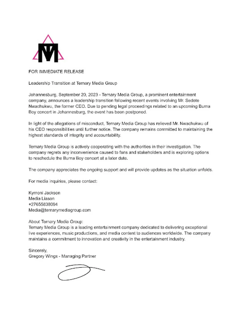 Leli phephandaba liveze ukuthi uSedote Nwachukwu oyiCEO yenkampani iTernary Media Group okuyiyona ebihlela umsebenzi wokuletha lo mrepha kuleli, umisiwe emsebenzini ngenxa yokusolwa wuphathina wakhe ngokuqola le nkampani imali elinganiselwa kuR10m