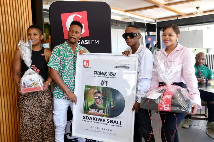 KUSUKELA kwesokunxele wuMinenhle Dlamini noPinky Kunene beGagasi FM, beklomelisa uBless The Gentleman noBlaq Major ngokuhlukanisa unyaka ngengoma yabo ethi Sdakiwe Sbali kulo msakazo Isithombe: FACEBOOK/GAGASI FM