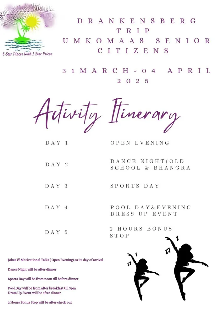 Ngokwemibiko evelayo, leli zalukaza kwakumele zibe neholidi elisuka eMkhomazi libheke eDrakensburg ngomhlaka 17 kuya ku 21 Disemba ngonyaka odlule, kodwa lwahlehliselwa ekupheleni kwenyanga kaMashi ngenxa yesimo sezulu esingesihle. Umuntu emunye ekhokha imali engu-R1950 kumhleli wohambo.