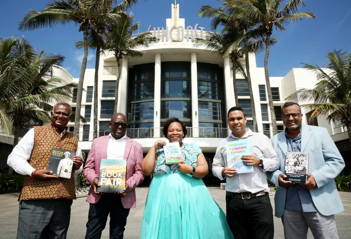 UNGAPHUTHELWA yindumezulu yombukiso wezincwadi, iDurban International Book Fair, ezoba ngo-Agasti 9-13, 2023, eTsogo Sun, eSuncoast Globe. Kusukela kwesobunxele nguMnuz Kiru Naidoo, nguNksz Kiki Ntuli, umhleli weSolezwe, nguMnuz Sandile Mdadane, umhleli seSunday Tribune, nguMnuz Anivesh Singh weDurban International Book Fair, noMnuz Lee Rondganger umhleli we-IOL esifundeni, Isithombe: SHELLEY KJONSTAD / (ANA)