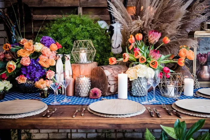 - Isitayela sokuhlobisa esihlanganisa imibala egqame kakhulu naleyo yakudala ejwayelekile emishadweni. Ungafaka amabhelunde nezimbali, ungaletha izihlalo ezinemibala ehlukene noma eziyisitayela esihlukene ematafuleni. Ungaletha nezipuni noma izinto zokudlela ezihlukene.