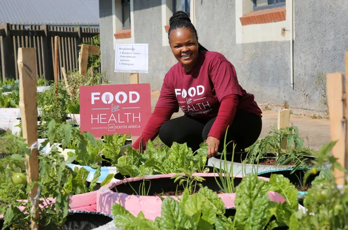 UNKSZ Pamella Ndlovu ongomunye wamalungu ophakathi asukumele phezulu ajoyina uhlelo lokutshala emtholampilo eSiphingo ukuze kunikwe iziguli ezineHIV imifino nezitshalo ezidingwa imizimba yazo olusungulwe i-Aids Healthcare Foundation (AHF) Isithombe: TUMI PAKKIES/INDEPENDENT NEWSPAPERS