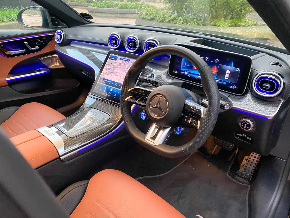 Ngaphakathi yiC Class oyaziyo ohehwa yi-touchscreen yeMBUX infotainment system enkulu. Yilapho uhlela khona yonke into ngemoto, uxhume iselula nge-Apple CarPlay ngaphandle kwentambo yize ibibuye ibe nokunqamuka kancane, uveze inkombandlela, ubone ingaphandle nengoba inamakhamera emzimbeni nokunye. Kokunye uke uthi uyazixoxela uzwe isukubuza ukuthi ingakusiza ngani njengoba ukwazi ukuyilawula ngephimbo uma uthe “Hey Mercedes”.