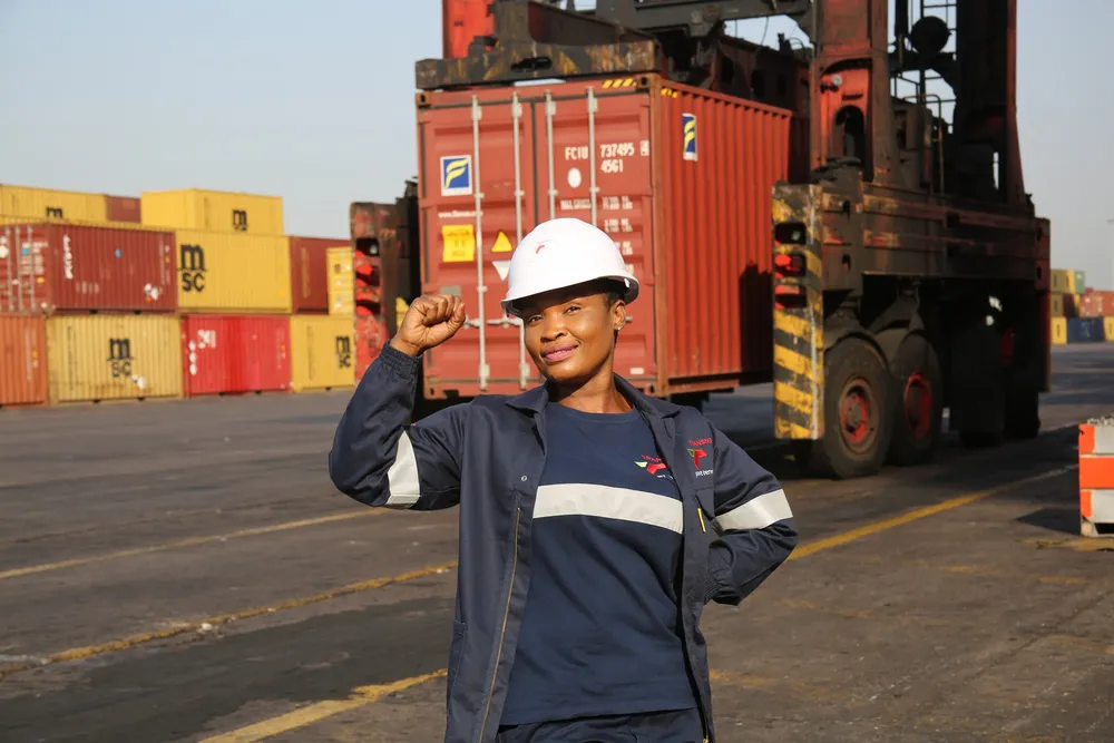 “Ngifike ngafundiswa ukuba yiDAV (Driver Articulated Vehicle) okuwumshini oqukula amakhonteyna elolini. Ngibe sengidlulela ekubeni wu-controller, kuyimina engilawula umsebenzi wokuthululwa kwamakhonteyna. Kwathi ngo-2022 ngaba wumshayeli wo-crane,” kusho uNksz Hlongwa.