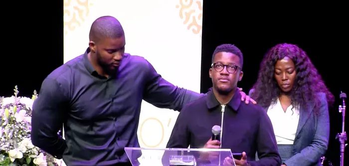 INDODANA kaNandi Nyembe, uBongo Nyembe, (kwesokunxele) nomzukulu wakhe, uJabulani Nyembe, (kwesokudla) bekhuluma enkonzweni yesikhumbuzo