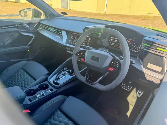 Ngaphambili ine-touchscreen infotainment system owenza okuningi kuyo njengokudlala umculo ezipikheni ezintsha zeSonos ezikhala kamnandi. Iphinde ibe ne-digital instrument cluster okanye i-virtual cockpit plus ngokolimi lwakwa-Audi nayo eveza okuningi ngale kwejubane kodwa ikukhombisa amandla ne-torque, g-forces, izikhathi zama lap nokunye.