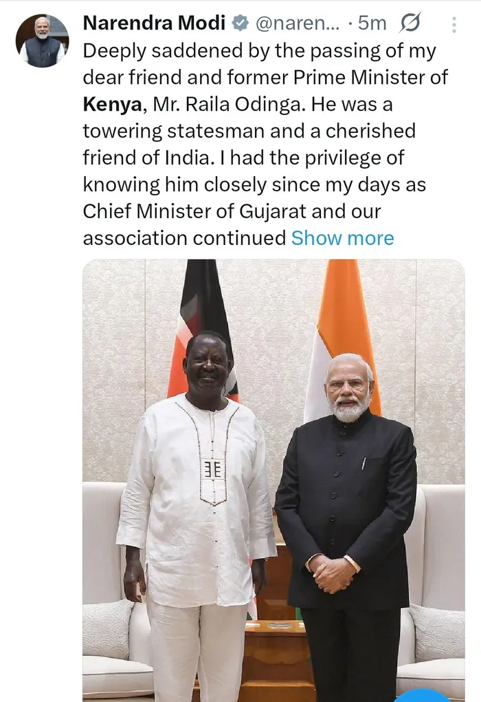 USihlalo Wekhomishini Yenhlangano Yezizwe Zase-Afrika (i-AUC), u-H.E. UMahmoud Ali Youssouf, uzwakalise ubuhlungu obukhulu ngokudlula emhlabeni kuka-H.E. U-Raila Amolo Odinga, owayenguNdunankulu weRiphabhulikhi yaseKenya, kanye nesikhulu sezwekazi lase-Afrika.