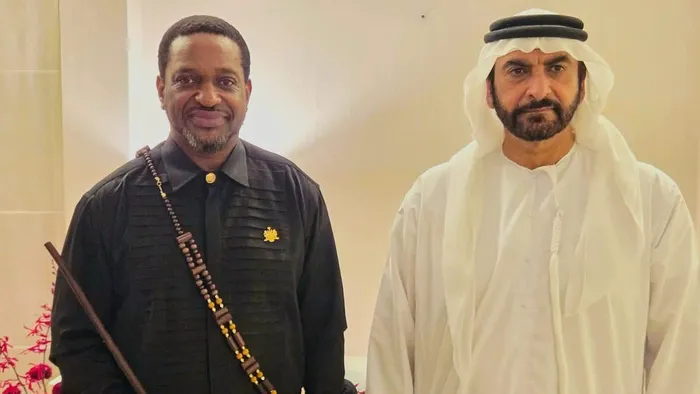 Ingonyama kaZulu uMisuzulu kaZwelithini ivakashele uSheikh Alhassan Bin Ali Al-Nuaimi esigodlweni sakhe e-Ajman, e-United Arab Emirates.