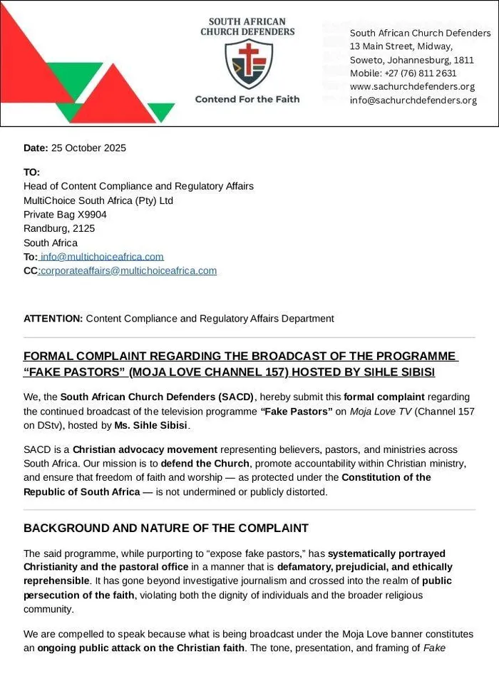 INHLANGANO evikela isithunzi namalungelo amabandla kuleli, iSouth African Church Defenders (SACD), seyinqumele abeMultiChoice nabeMoja Love ugwayi katiki ithi akakhonjwe indlela umethuli wohlelo iFake Pastors kwiMoja Love, uSihle Sibisi, bese bebuyekeza nalolu hlelo ngaphambi kokuba ihlohle amakholwa ukuba adube izinhlelo futhi alaxaze iDStv (okuyiyo esingethe iMoja Love).