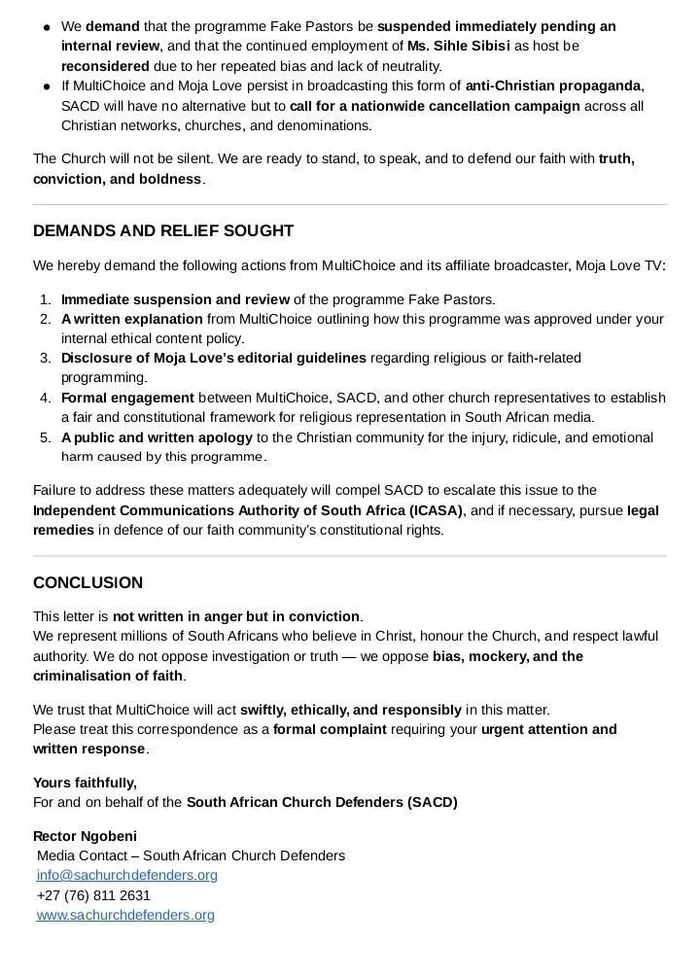 "Sifuna uhlelo iFake Pastors lumiswe ngokushesha kuze kuqedwe ukubuyekeza kwangaphakathi futhi nokuqashwa kukaNksz Sihle Sibisi kucutshungulwe kabusha ngenxa yokuqhubeka kwakhe nokuchema."