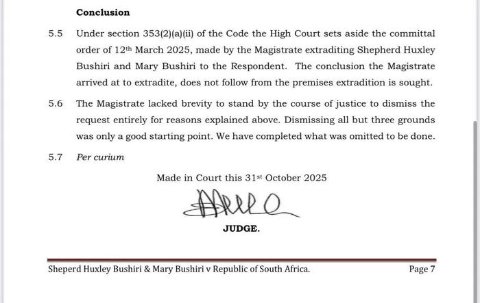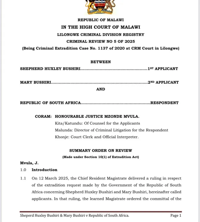 Ozibiz ngoMphrofethi uShepherd Bushiri kanye nonkosikazi wakhe, uMary, baphumelele empini yokubuyiswa kuleli bebhekene nohulumeni waseNingizimu Afrika eMalawi. INkantolo eNkulu yaseMalawi iwubekele eceleni umyalelo wangomhla ziyi-12 Mashi 2025 owakhishwa yiNkantolo yeMantshi eLilongwe, eyayalela ukuthi uBushiri nomkakhe bazinikele kuhulumeni waseNingizimu Afrika ukuze babhekane namacala ahlukene ababekwe wona.